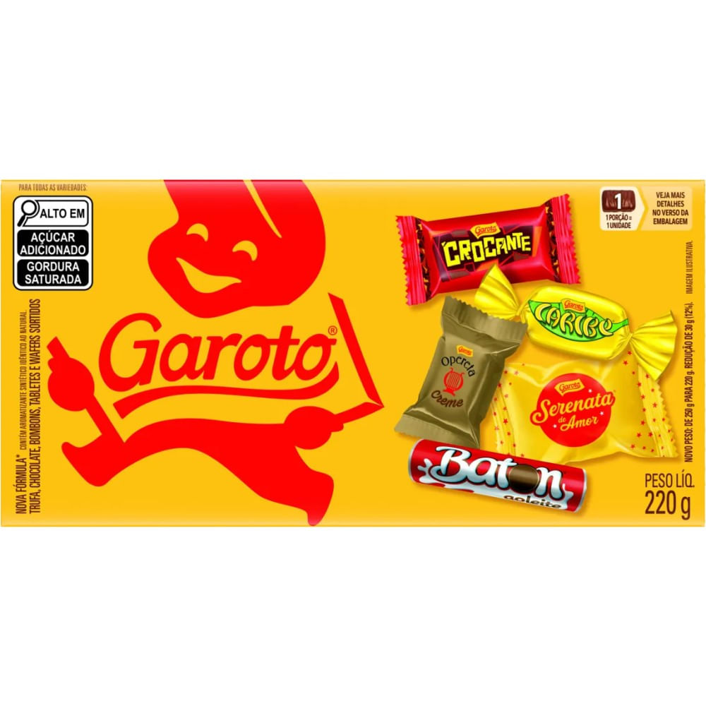 A Caixa Garoto reúne os maiores sucessos da marca em uma seleção de 220g para agradar a todos os gostos. De clássicos como Serenata de Amor a sucessos como o Baton, é o presente ideal para qualquer ocasião. Compartilhe sorrisos e muito chocolate com quem você ama.