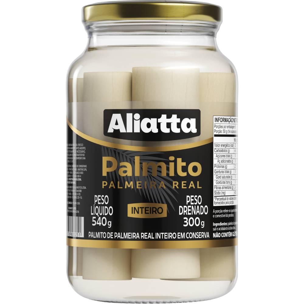 O Palmito Real Aliatta Inteiro destaca-se pela sua textura macia e sabor delicado, sendo conservado com todo o frescor. É o ingrediente nobre que faltava para elevar o nível de suas saladas e pratos gourmet. Experimente a excelência da Aliatta em sua mesa.